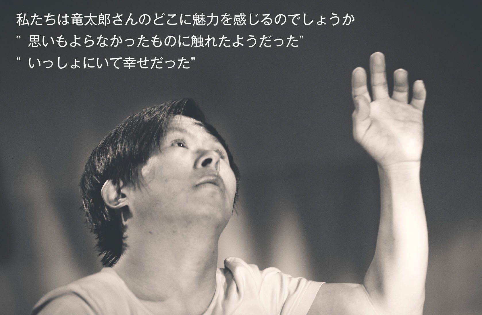 「ぼくのダンスをみて欲しい。ぼくのからだをみて欲しい」彼のユニークな存在から生まれる即興のダンスはストレートに私たちに訴えかけてきます。竜太郎さんにしか踊れないダンス。そのダンスに私たちは、心揺さぶられます。何故でしょう?どうしてこのように感動するのでしょうか?みた方は、そのように自分に問いかけることでしょう。倒れ込むまで踊る彼のストイックなダンス。竜太郎さんは、踊ることが嬉しくて楽しくて、踊った後に涙がこぼれてしまうこともあります。共演してくださる方々には、ありがとう・・ありがとう・・・とたくさんお礼を伝えます。