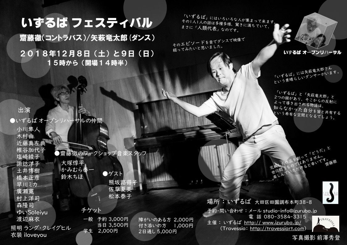 2018/11/01 13:48いずるばフェスティバル 12月8日と9日のニ日間、スタジオ「いずるば」にて。両日ともに15時から。 「ぼくのからだはこういうこと」監修の齋藤徹さん(コントラバス)と矢萩竜太郎さんを中心に「いずるばオープンリハーサル」の仲間たち(受講生)による成果発表的なパフォーマンスと、ゲストによる即興セッションが楽しめます。 成果発表的なパフォーマンスは現在、齋藤徹さんの指揮のもとで、オープンリハーサルの仲間たち、音楽スタッフやご支援いただくゲストのみなさまとの稽古が進んでいます。 「いずるば」の魅力や、竜太郎さんに会いに、どうぞおいでください。 (料金) 予約3,000円 当日3,500円/ 障がいのある方2,000円 付添いの方1,000円 もっと見る