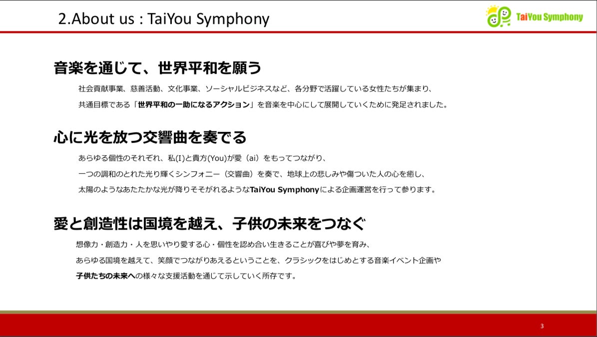 TaiYou Symphony-太陽交響曲-は、「未来の子どもたちにも美しい世界を残そう」という趣旨のもと、音楽・文化事業と社会事業を繋げていくプラットフォームです。