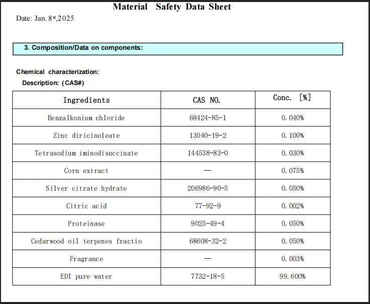 下表、消臭剤のMSDS:化学物質等安全データシート 取得済。
