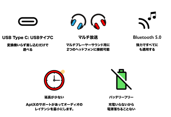 今までさまざまなBluetoothアダプタが発売されましたが、任天堂のスイッチ向けでUSBタイプCを用いて設計されたものはありませんでした。既存のアダプタは遅延性、ノイズ・雑音、音質・音量の低下、またApple AirPodsなどの新しいデバイスへの対応が無いなど課題を抱えています。