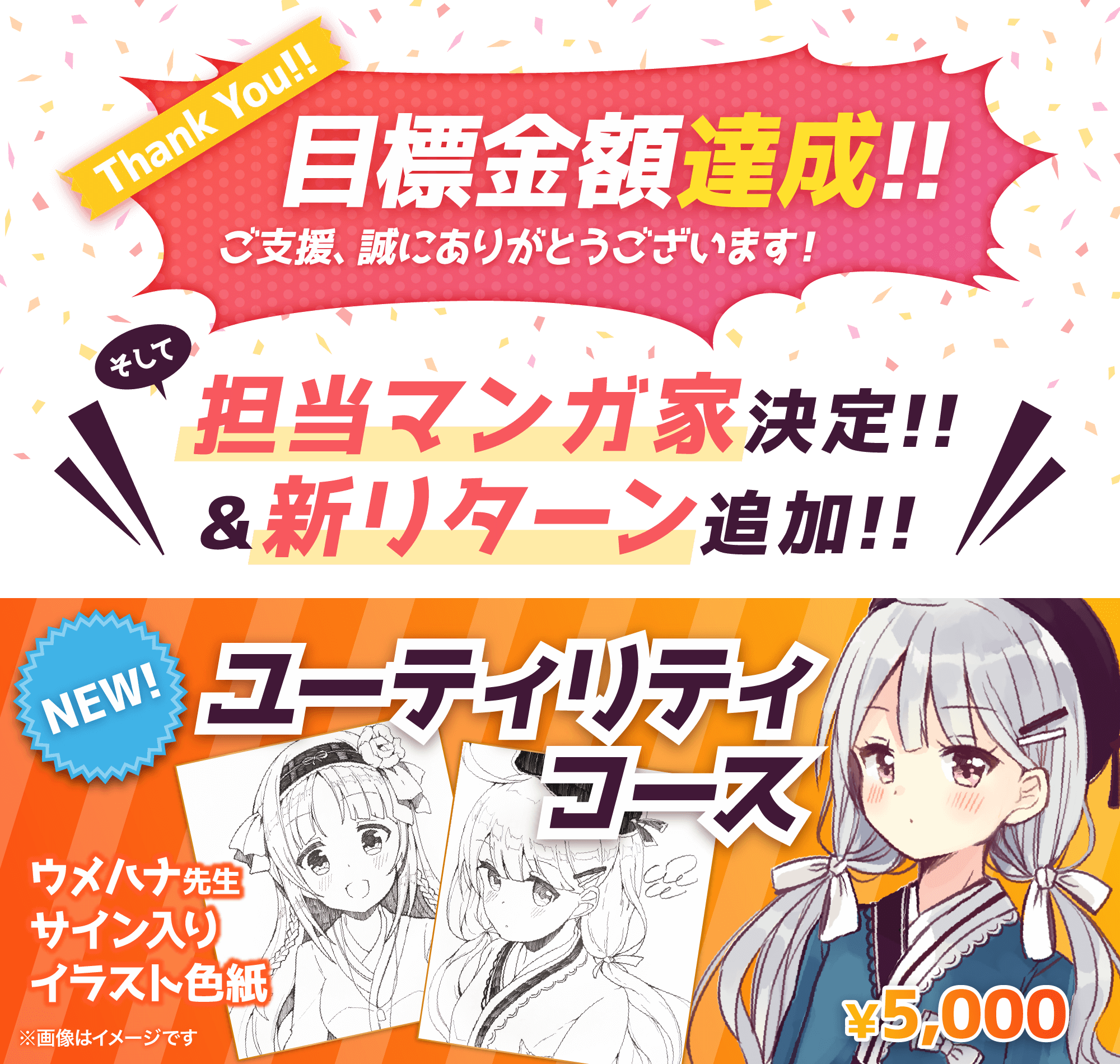 「初めまして、ウメハナと申します。経験の浅い私が皆様の期待に応えることが出来るか不安ですが、佐倉おりこ先生の可愛らしいデザインに、魅力的な設定のキャラクターを見ているうちに、自分の中で様々な妄想が膨らんできて、今は早く描いてみたい気持ちでいっぱいです。皆様に楽しんで頂けますように、精一杯に描いていきたいと思いますので、応援よろしくお願いいたいします!」