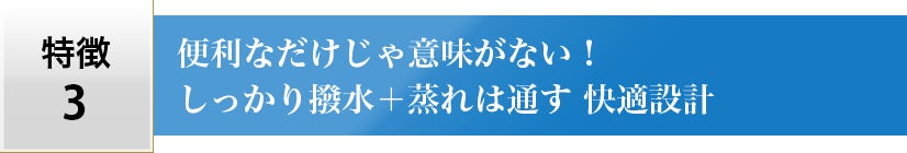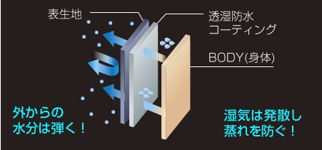 水蒸気を通し、雨風は通さない特徴があります。 雨風をしっかり防ぎながら、内部の水蒸気は通すので蒸れにくく快適な着心地。