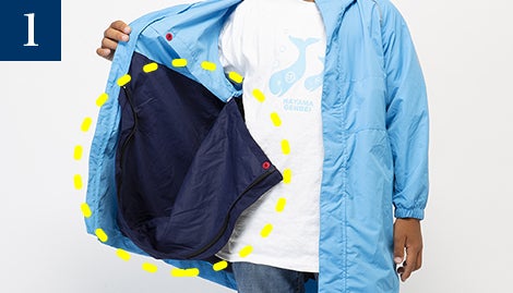上着の内側にズボンが内蔵。 靴も脱がずに、ズボンがはける。