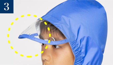 つば付(透明塩化ビニール)で強い雨でも顔回りを防ぎ、