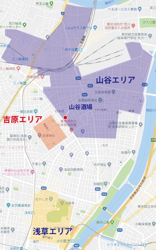 (山谷とその周辺。財団法人 城北労働・福祉センター作成『山谷地域マップ』を元に作成)