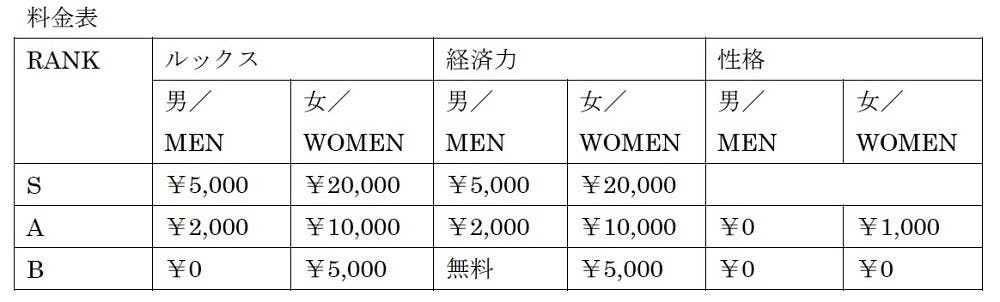 ※1 ルックスA・経済力Aの女性会員とマッチングをご希望の場合、10,000+10,000=20,000円です。