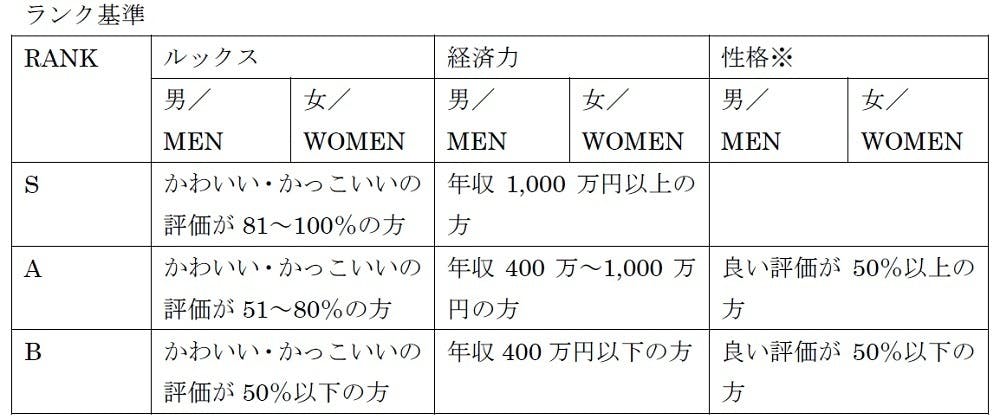 まず、会員になられたら運営の指針に則りルックス・経済力・性格の項目ごとにランク付けします。