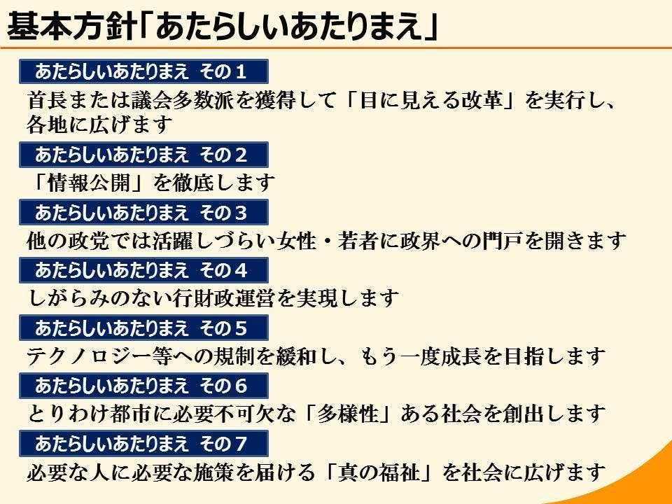 具体的には、私たちは議席を獲得した地方自治体において、以下の7つの「あたらしいあたりまえ」と名付けた方針に基づき、政策立案を行っていきます。