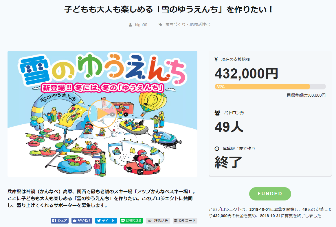 2018/11/08 14:08この度は、アップかんなべの「雪のゆうえんち」プロジェクトに ご支援やご関心をお寄せいただき、誠にありがとうございました。 一か月の期間で49名のパトロンの方々から432,000円の金額を ご支援いただくことができました。 直接にご支援いただいた方のみならず、このページを見てくださっているすべての方に、 まず、この場をお借りしてまずお礼申し上げます。 終わった後の率直な感想は、「大変だったけど、やって良かった」と思っています。 クラウドファンディング期間中は、「応援したいけど、 インターネットでの支援方法がわからないから」、と現金をくれて支援してくださった 地元の方々もいらっしゃいました。 また、普段スキー場で顔合わせる方から、「今年はこんなことやるんやね」と CAMPFIREを通して知っていただき、スキー場運営について意見をもらうこともできました。 またまた、スキー場の運営に関してこれまでのお客様からメッセージで様々な (そして、めっちゃおもしろい)ご提案をして下さる方もいらっしゃいました。 こういう一つ一つが今回の挑戦で生まれた出来事でした。 今後も「アップかんなべ」をもっと身近に感じていただき、 「なんとなく応援したい施設」、と思っていただけるように こういった機会をつくっていきたいと思います。 重ねまして、ありがとうございました!! これからも応援宜しくお願いします! アップかんなべ 樋口 P.S. 準備の状況をみなさまに共有します! こちらがフワフワ滑り台エリアに置く遊具たちです! オープンは12月下旬予定!乞うご期待~。 もっと見る