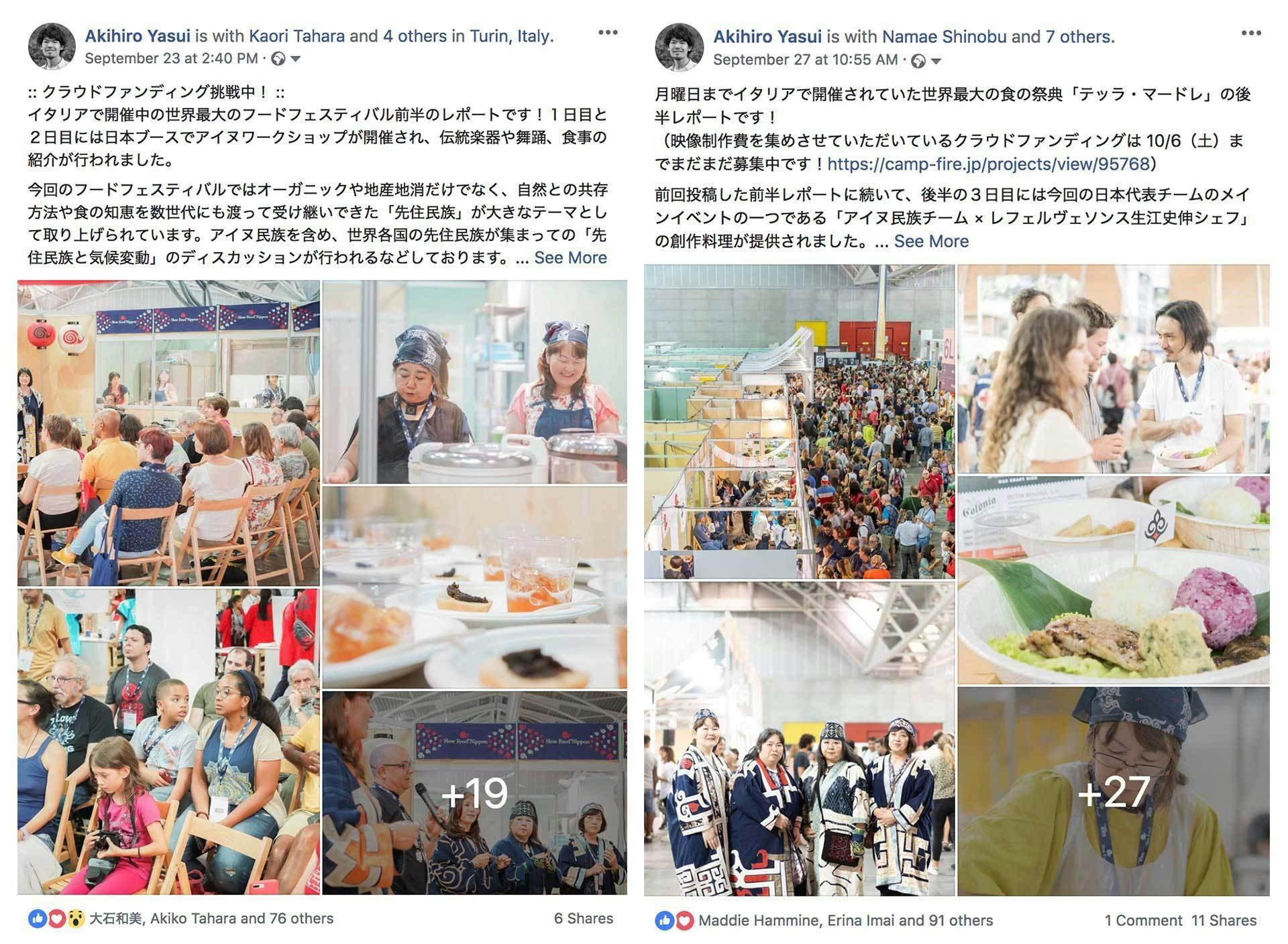 • クラウドファンディングは10月6日 23時59分に無事に目標金額を達成して終えることができました!最終的には57人の方に支援者になっていただき、合計で547,000円の活動資金を集めさせていただくことができました。御支援頂きました方々、そしてプロジェクトをシェアいただきました方々、皆様本当にありがとうございました! イタリアでの撮影中に風邪を引き、テッラ・マードレ後にあと10日を残してまだ10人ほどの方にしか支援をいただけていなかったときには正直「難しいかも..」と思いました。ただイタリアで世界に日本の文化を広めるため朝から晩まで頑張っていたアイヌの方々や生江シェフ、日本代表メンバーのことを思い浮かべると「あきらめる」という選択肢は一切ありませんでした。 9月24日にイタリアからドイツに帰ってからは他の撮影もある中で、徹夜で「アイヌ予告編」や「日本代表チーム」の映像を編集していました。イタリアに来られなかった日本の方々にも、予告編映像を通じて私が見たアイヌチームが活躍している姿をどうしても届けたかったからです。 FacebookとTwitterで映像を公開すると、次々と嬉しいメッセージをいただき本日のクラウドファンディング終了日まで継続することができました。(本日終了2時間前に目標金額に達した時にはこれまでたまっていた疲れがドッと押し寄せしばらく休んでいました..) 今後の撮影の予定ですが、新年に北海道を訪れアイヌの新年を迎える儀式アシリパノミを撮影します。雪が溶けた春にはアイヌ食に使われる山菜採りの様子が撮影できるかと予定しています。 2021年の「先住民族テッラマードレ」の日本開催については現在協議中とのことですので、最新情報はスローフード日本(http://www.slowfood-nippon.jp/)をチェックしていただければと思います。決まり次第僕もSNSでお知らせさせていただきます。(スローフードは日本全国に拠点があり地産地消やオーガニック、伝統食、フードロスになる食材の活用を現代に広める活動を行なっているので、気になる方はクラウドファンディングページの地図から調べてぜひ一度活動に参加をしてみてください。僕も日本とドイツのスローフードの活動に参加しています。) 僕にとってクラウドファンディングはただ資金を集めるだけでなく、共通の関心のプロジェクトを介して「人と人とが出会う機会」だと思っています。僕もこのアイヌ映像プロジェクトに共感していただいた皆様の活動に関心がありますので、差し支えなければSNSで友達リクエストをいただければと思います。今後アイヌプロジェクトの撮影状況やその他の近況報告を共有させていただけるかと思います。 これからも世界がより持続可能な、サスティナブルな道に進むように活動をして参りますので、今後ともよろしくお願い致します。 安居昭博Twitter: https://twitter.com/akihiroyasui_Facebook: https://www.facebook.com/aki.hiro.co.jpInstagram: https://www.instagram.com/akihiro.yasui/YouTube(Earthackers): https://www.youtube.com/channel/UCIT_fFOs5cD5lLLpAugq1qA?YouTube(サスティナブルチャンネル):https://www.youtube.com/channel/UClRL1-AR96vPDXE__KUNMzw?  もっと見る