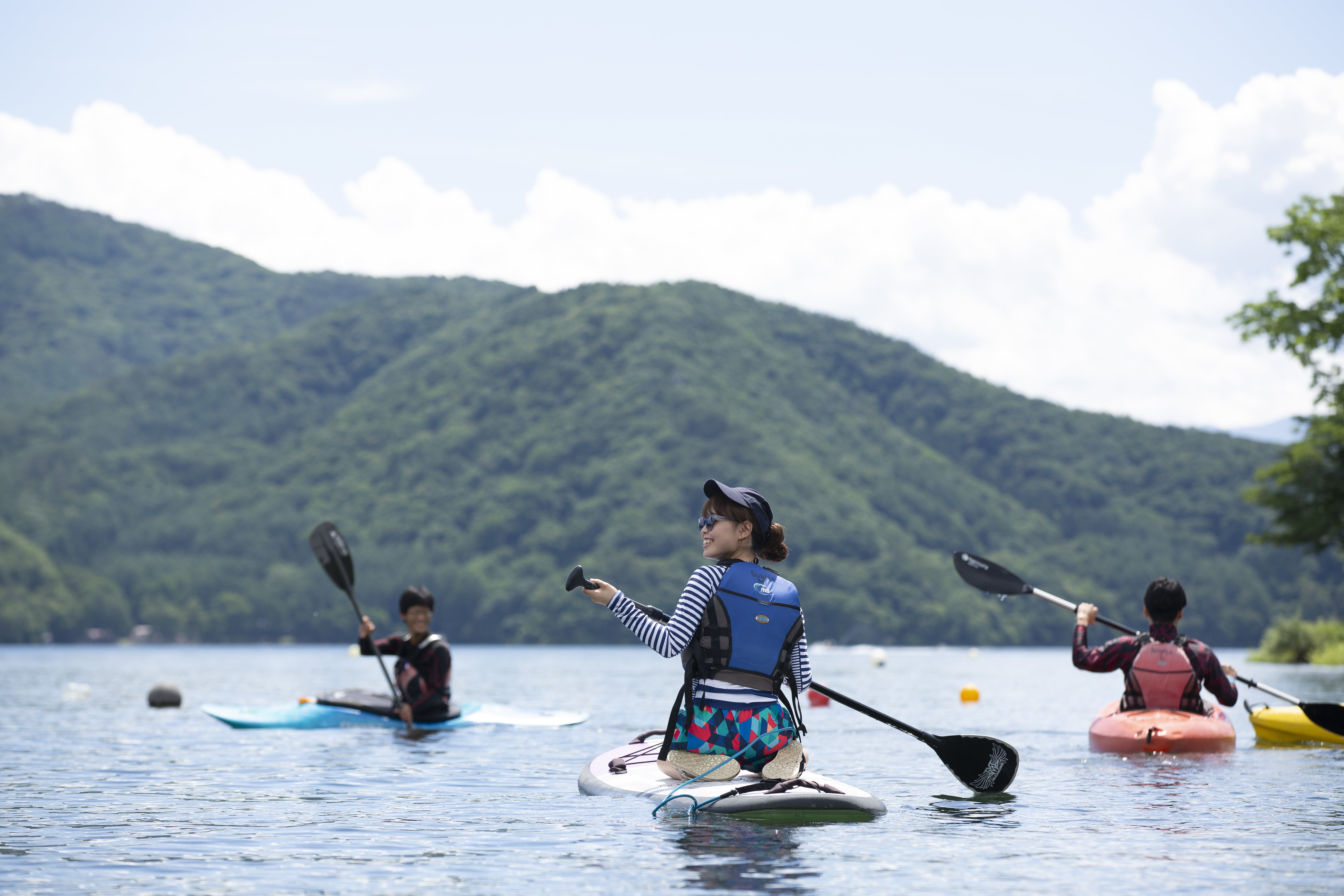 夏場は野尻湖で、カヤックやSUP(立ちこぎボード)、ウェイクボードなどを楽しんだり、