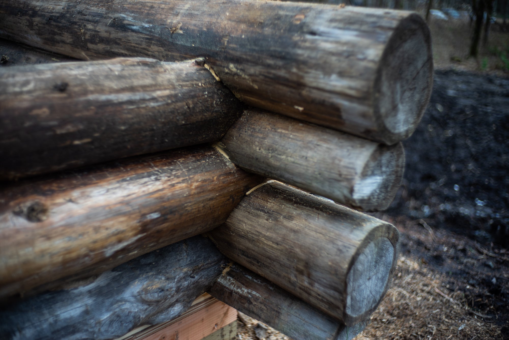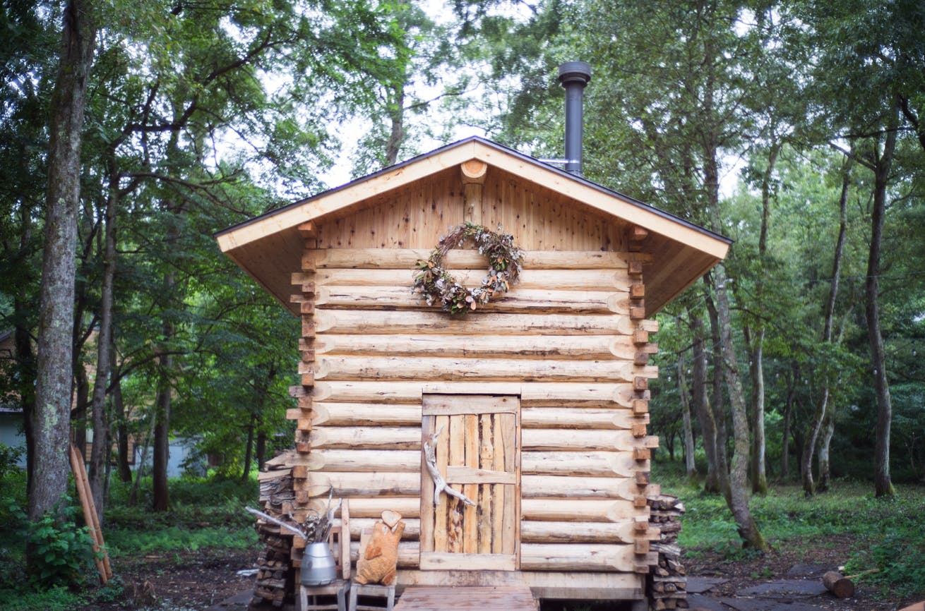 ヒノキの丸太をダイナミックに使った、サウナ小屋。