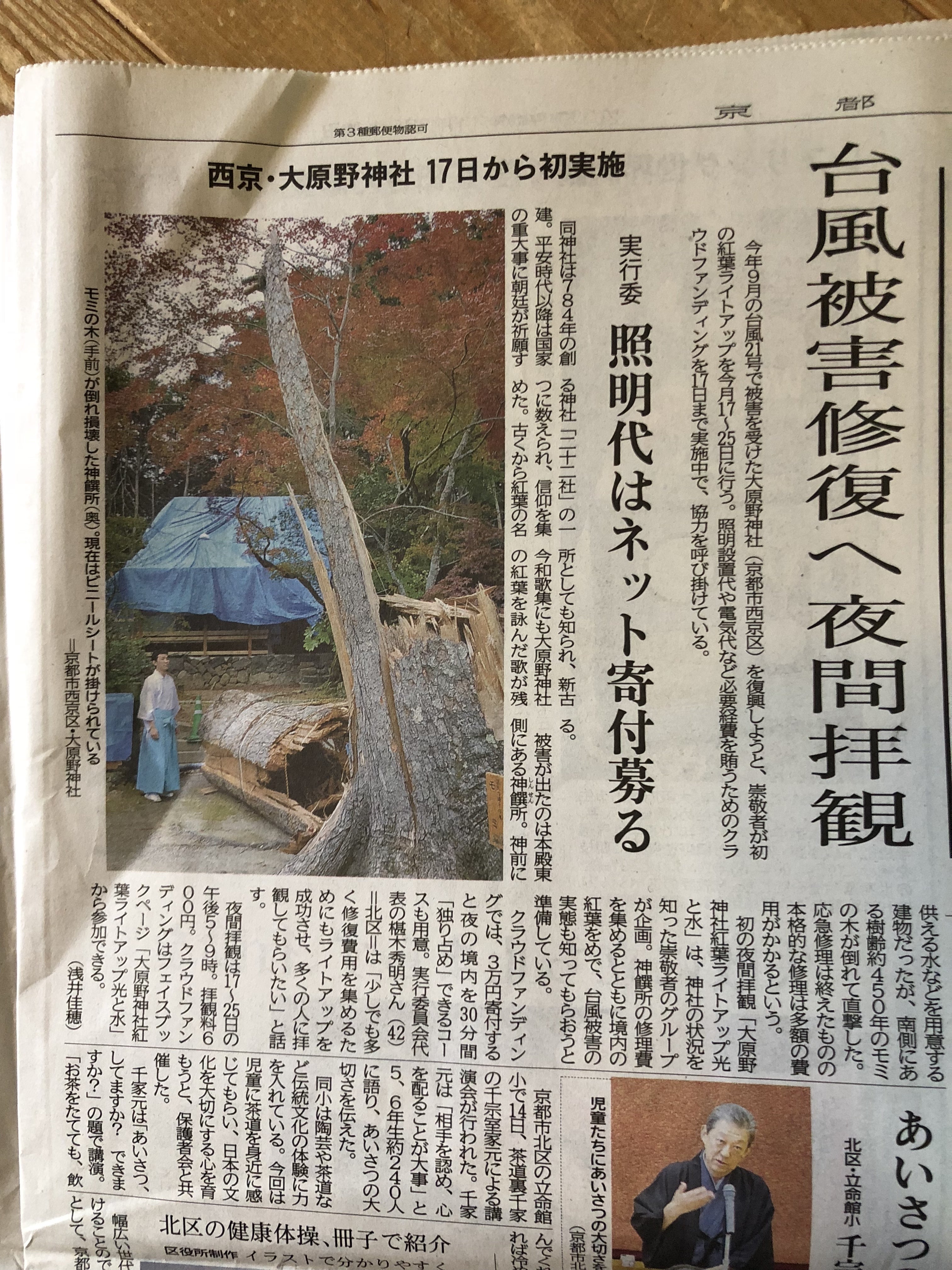 現在の日本は、少子高齢化や出生率の低下が問題視され今までの社会システムは綻び、日常生活にも少しづつ影響が出始めています。ここ最近では、異常気象で台風や地震が頻繁に起こり多くの地域で被害が出ています。今まで京都は比較的被害は少ない地域でありましたが、今回の台風21号では一般の住宅はもちろんインフラにまで影響が出ています。大原野神社においても一つのシンボルである区民の誇りの木樹齢450年のモミの木や境内にも多大な被害がありました。そういった中で、もう一度今までのような同じ生活に戻すことは簡単ではありません。体験して災害の辛さや大変さを身にしみて感じ普通であることの当たり前の有り難さがわかります。