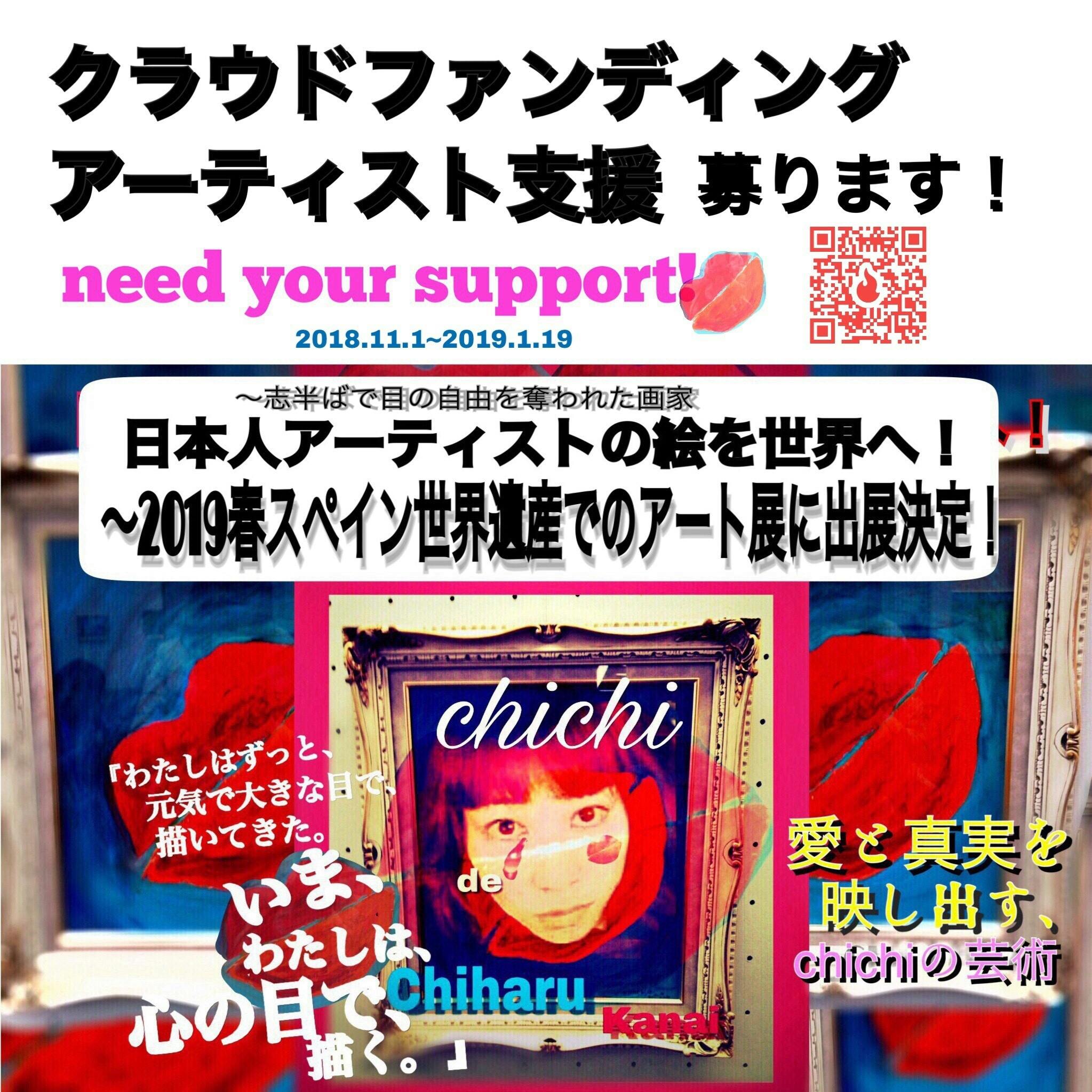 2019/01/19 05:32artist painter chichi『本日最終〆切!!』芸術家のチチは数年前不適切な医療措置により全身特に目にひどい後遺症負い苦難を抱えながら世界での発表の場をいくつも勝ちとり...そんな中更なる困難が! 後遺症により何と片目の視力をほぼ奪われる。2月にはモナコ、4月スペインで、その後も日本人アーティスト代表として世界での発表が待っている。日本人アーティスト代表として世界で活躍出来るようchichiを応援しよう❤︎https://camp-fire.jp/projects/view/97501※campfireのtop pageでchichiと検索すると出てきます❤︎Chichi de ChiharuKanai#chichi #画家 #芸術家 #クラウドファンディング #クラウドファンディング募集中 #アーティスト #アーティストサポート #アートコレクター #ギャラリー #美術館 #campfirejp #群馬 #群馬出身 #japaneseartist #artistejaponaise #バイヤー #gallery #art #galerie #visuallyimpairedartist #モナコ #monacojapon #スペイン #hardlifeartists #スペイン世界遺産 #高崎 #フランス #francojaponaise もっと見るあと3日で〆切!!