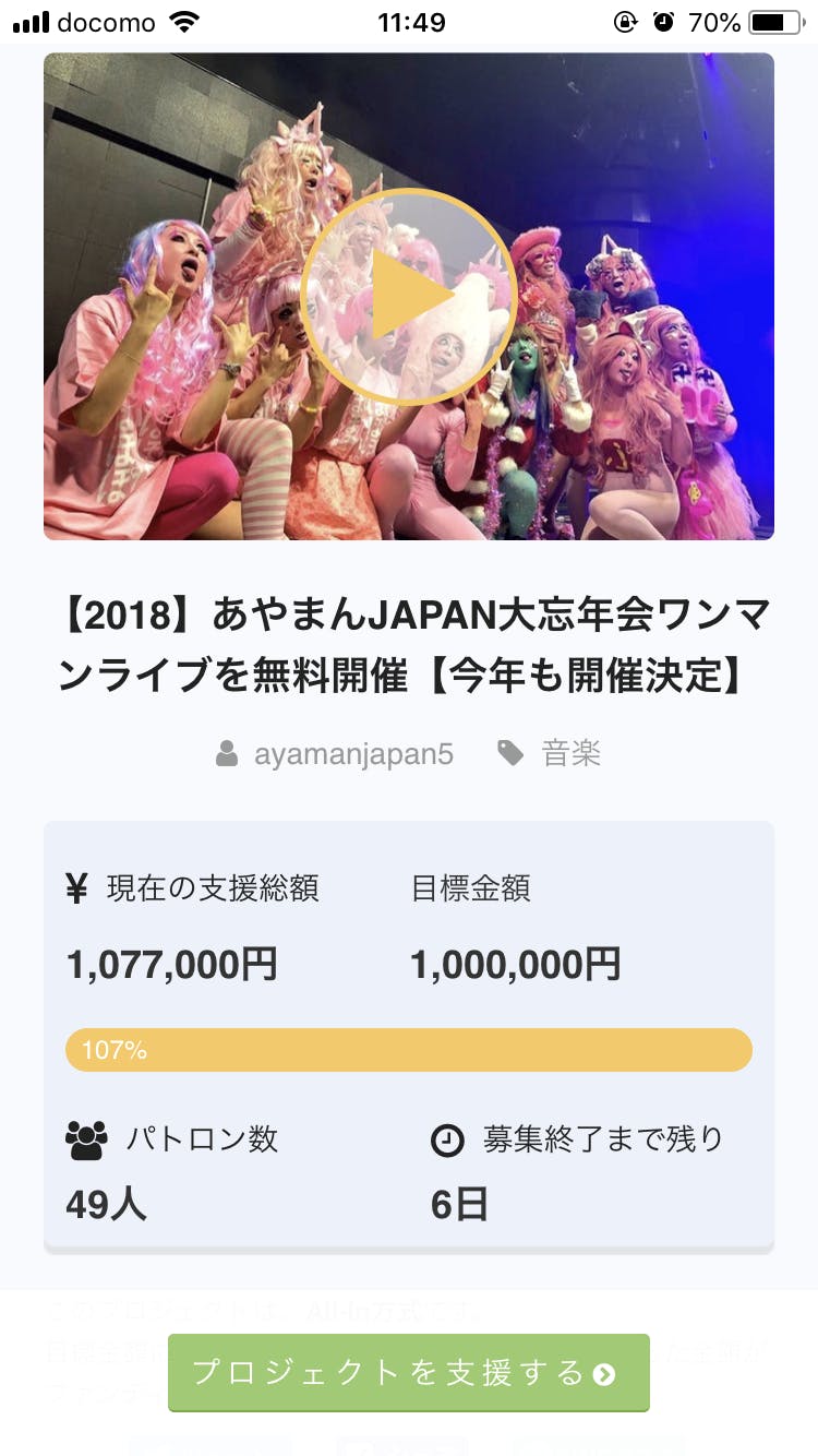 2018/12/04 23:23大忘年会ワンマンライブを無料開催したい!という気持ちで1ヶ月以上続けてきたプロジェクト…なんと、目標金額達成しました!! サクセスー!!!!!!!本当に、皆様のおかげでございます。支援してくださった皆様、クラファンを拡散してくださった皆様、関わって下さった全ての皆様に感謝、感謝、、、シャシャシャシャンパン乾杯でございます。でも、あと5日ある・・・ということは!?もちろんストレッチゴール目指します!目標金額は150万!!!!この目標金額に達成したあかつきには、・ワンマンライブ入場者全員に、大忘年会限定あやまんJAPANオリジナルのゴム素材グッズをプレゼント☆詳しいことは大人の事情で書けないのですが、、このゴムを使って、みんなイク時は一緒だよー!!あやまんJAPANはまだまだココじゃ終わらない。皆様、よろしくお願いしマッスルスティックー! もっと見る