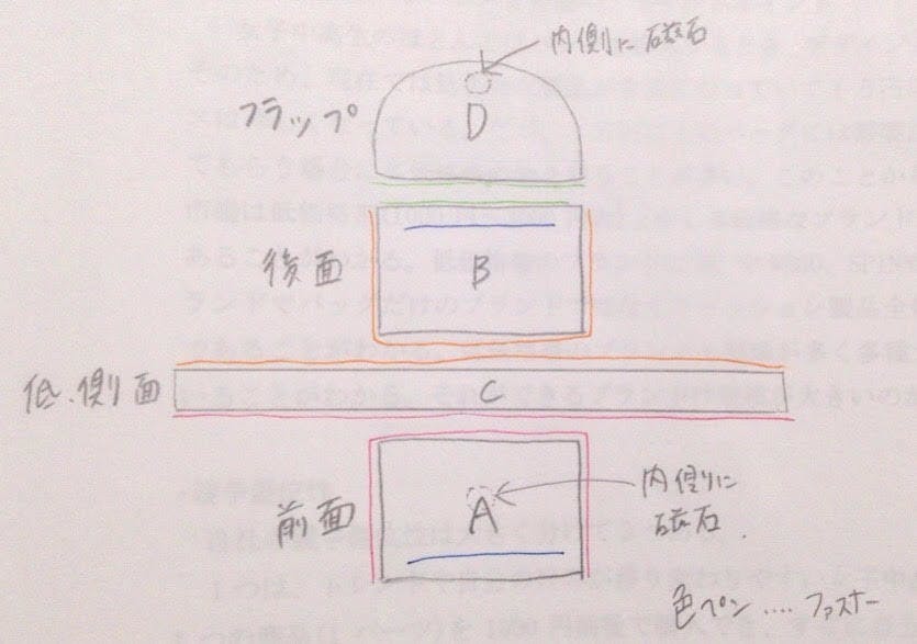 中学2年生の時に描いたバッグのデザインです。パーツをファスナーでつなぎ合わせてバッグにするというかたちは今のバッグと変わっていません。