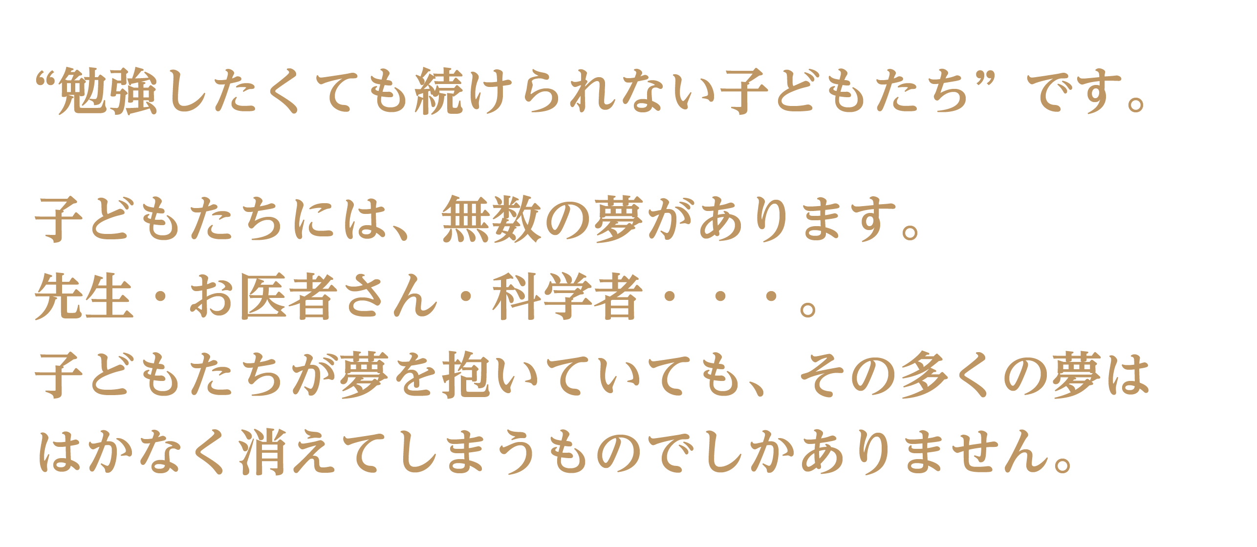 子どもたちは学校に入学できても、「家族の生活を助けるため」や「勉強することができず、文字を読み書きすることもままならず」、多くの子どもたちは卒業する前に中退をよぎなくされることが大きな社会問題となっています。