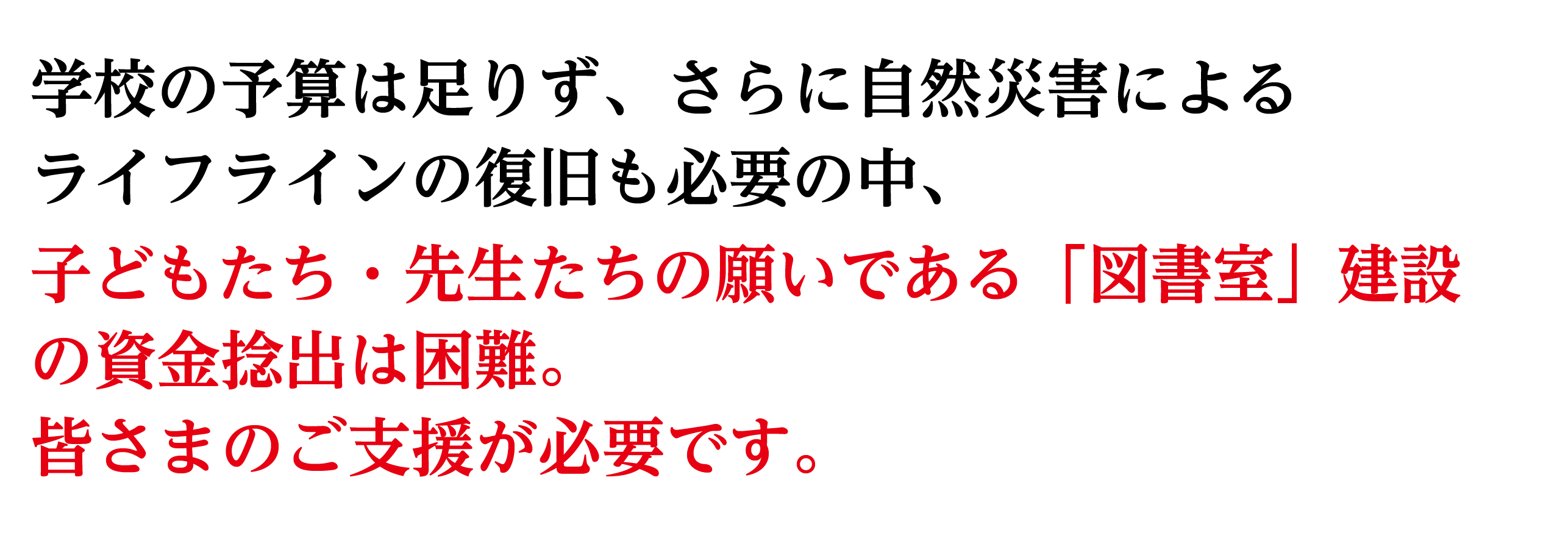 先生たちは、教室の隅に小さな多目的スペースを作り、子どもたちの「もっと学びたい」という気持ちに答えようとしていますが、とても十分とは言えません。学校の予算は足りず、支援金も台風災害によるライフラインの復旧や学校そのものの復旧が優先され、子どもたち・先生たちの願いである「図書室」建設の資金捻出は困難な状況です。