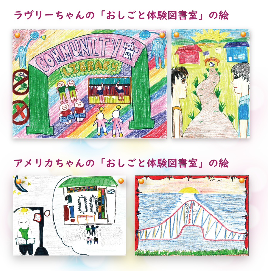 「図書室」の建設は、子どもたちの願いです。ラヴリーちゃんとアメリカちゃんが「おしごと体験図書室」の絵を描きました。私たちには想像がつかない彼女たちの”図書室ってどんな場所?の想い”が込められています。