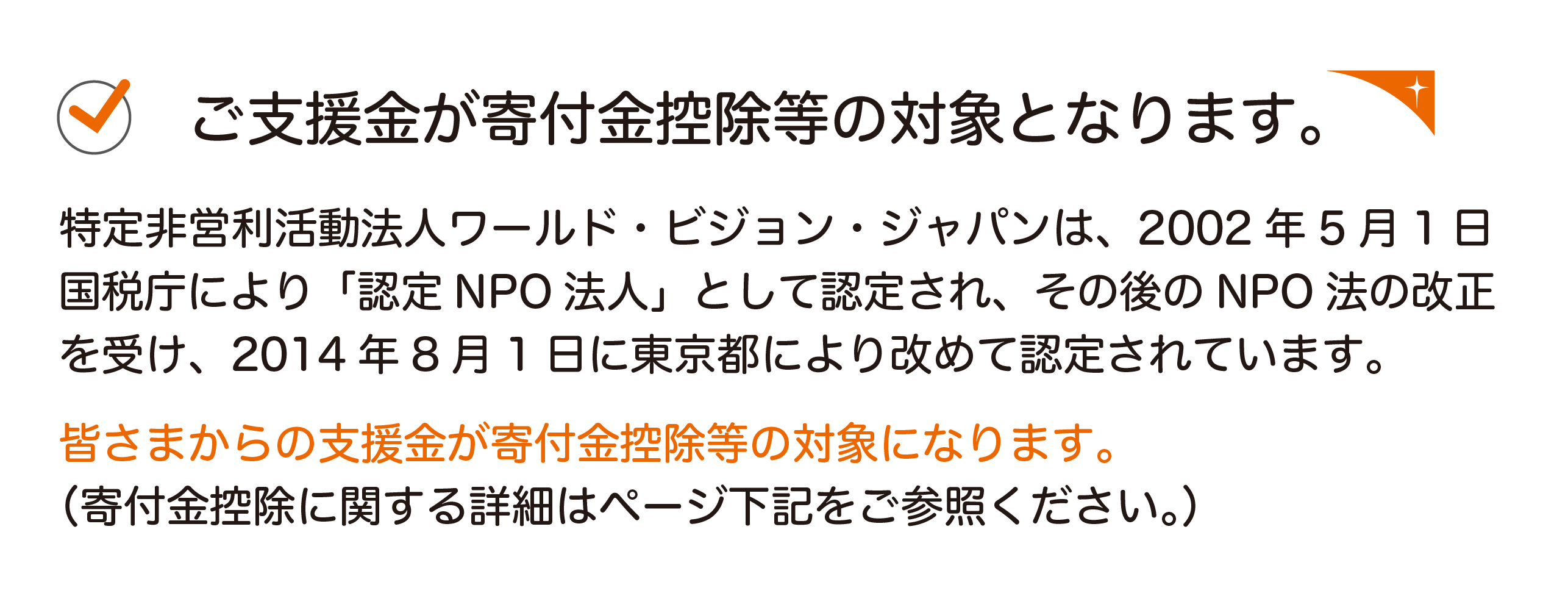 ワールド・ビジョン・ジャパンは、東京都より認定を受けた認定NPO法人のため、いただいたご支援金は寄付金控除等の対象になります。確定申告によってこの税制優遇を受けることができます。