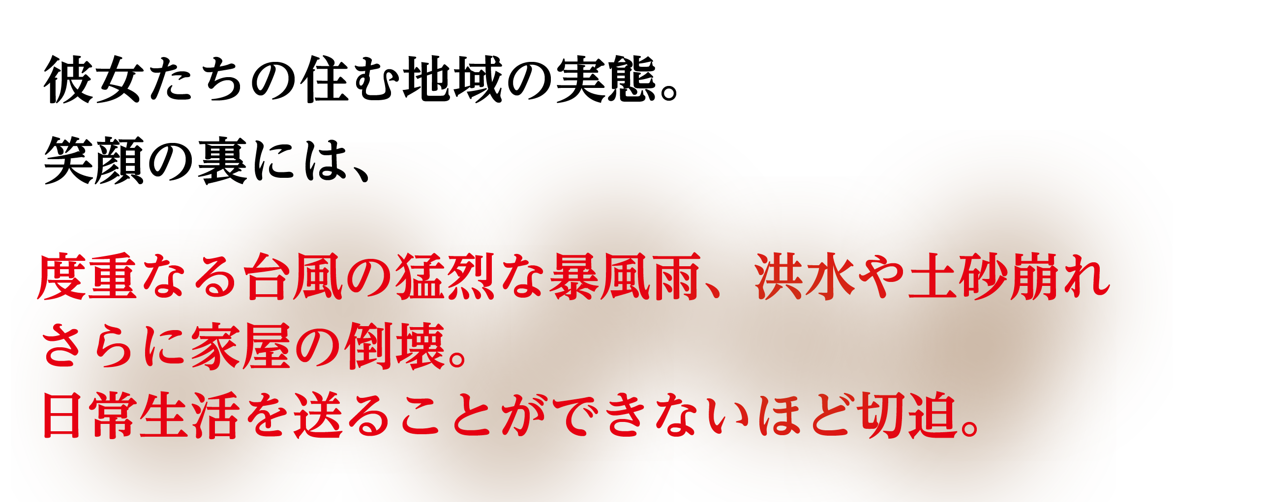 フィリピンのサマール地域(首都のマニラから南東へ約580kmの場所に位置する島)は、度重なる台風により猛烈な暴風雨にさらされるだけでなく、洪水や土砂崩れなどをも巻き起こし陸の孤島状態になるとともに、川が氾濫して土砂や倒木により家屋が流される被害も発生します。電気や通信網が寸断され、連絡さえもままならない事態もあります。