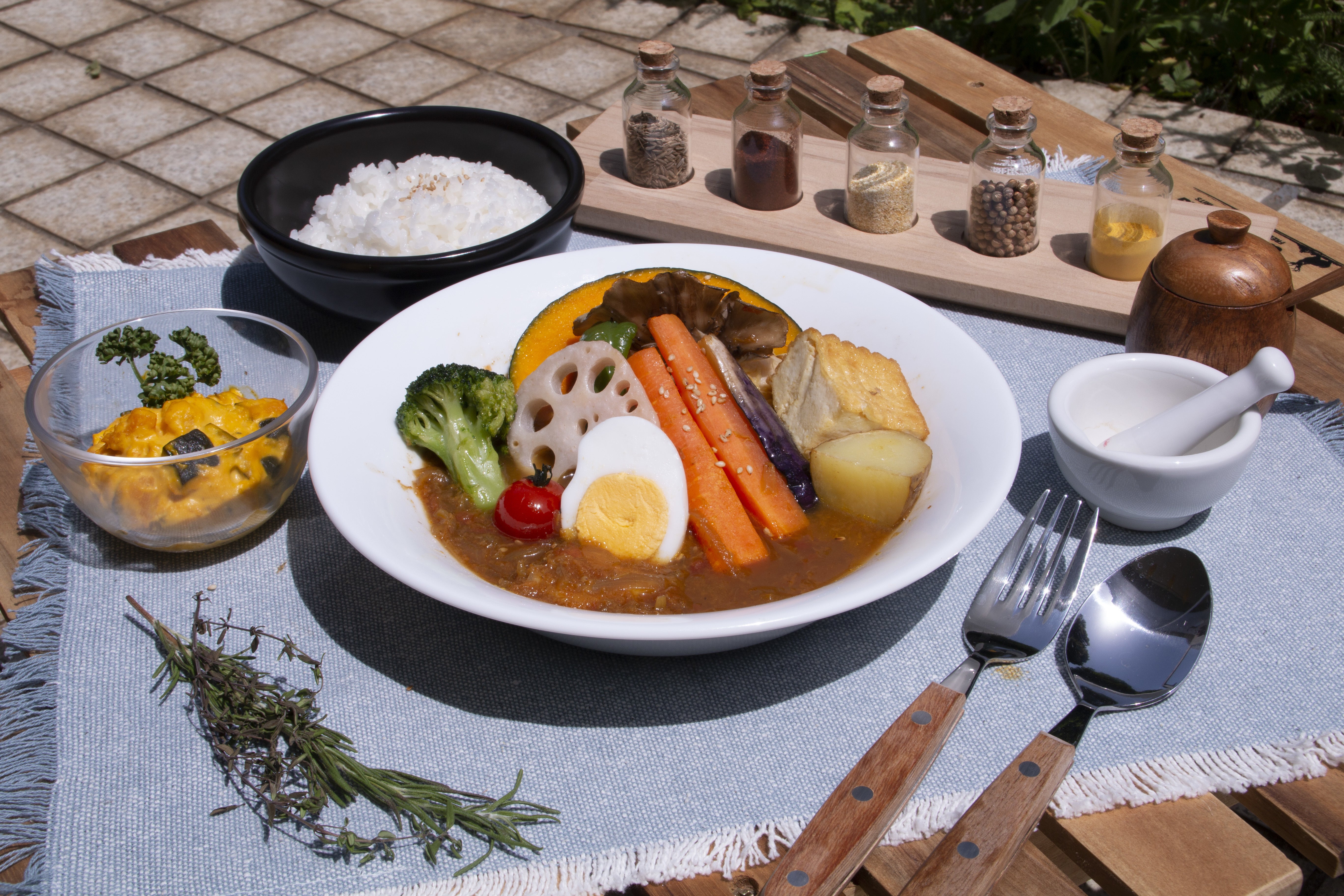 施設のそばを流れる都幾川の河川敷でフィンランドのようなサウナ体験を提供した後は、カフェでゆったり食事もお楽しみいただけます。おすすめは、とうふ工房わたなべの厚揚げ豆腐と10種の地元野菜カレー 。