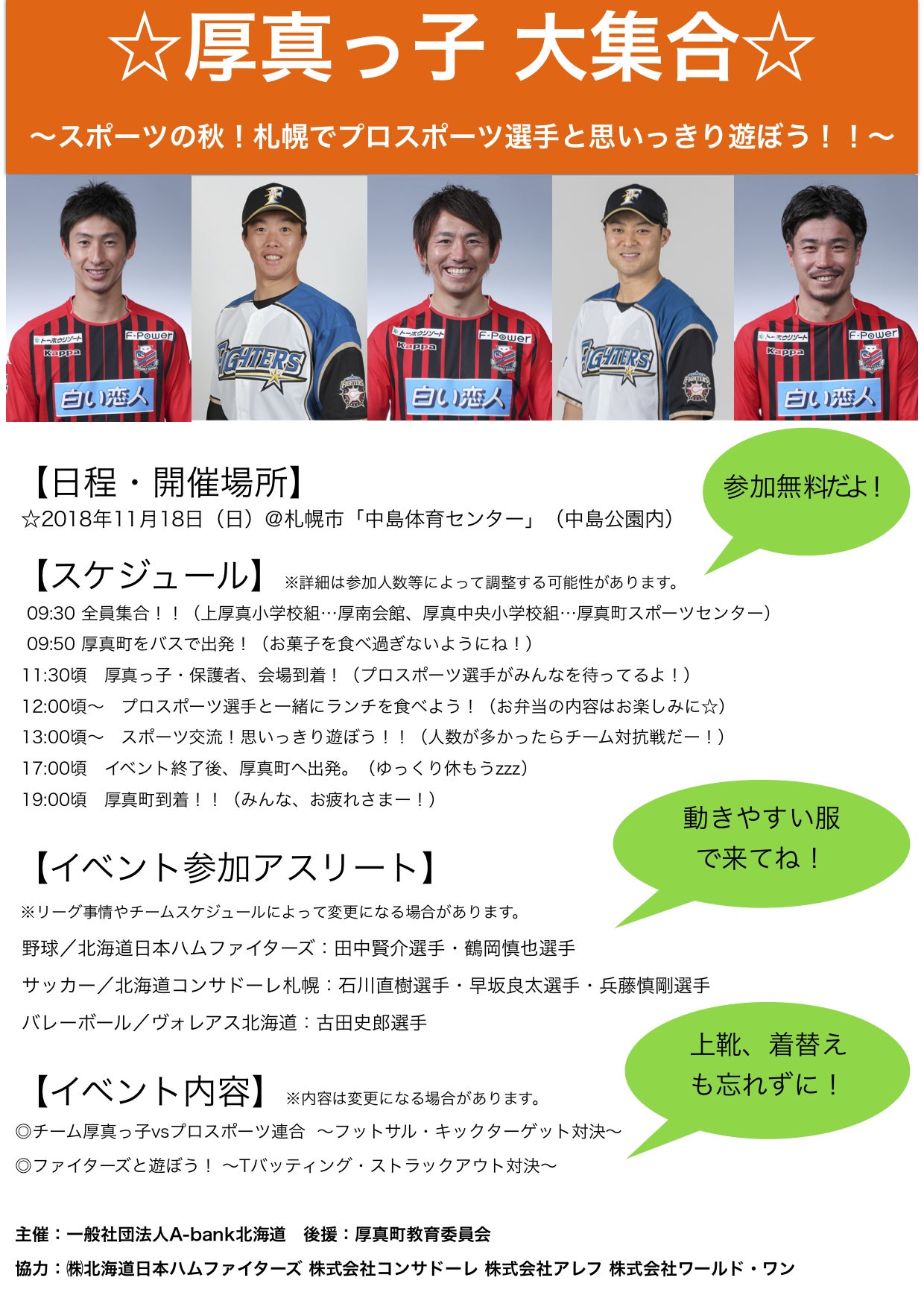 今回の地震によって大規模な土砂崩れが起きた厚真町の小学生全員を札幌に招待し「アスリートと一緒に楽しむスポーツイベント」を開催する事を目指しています。