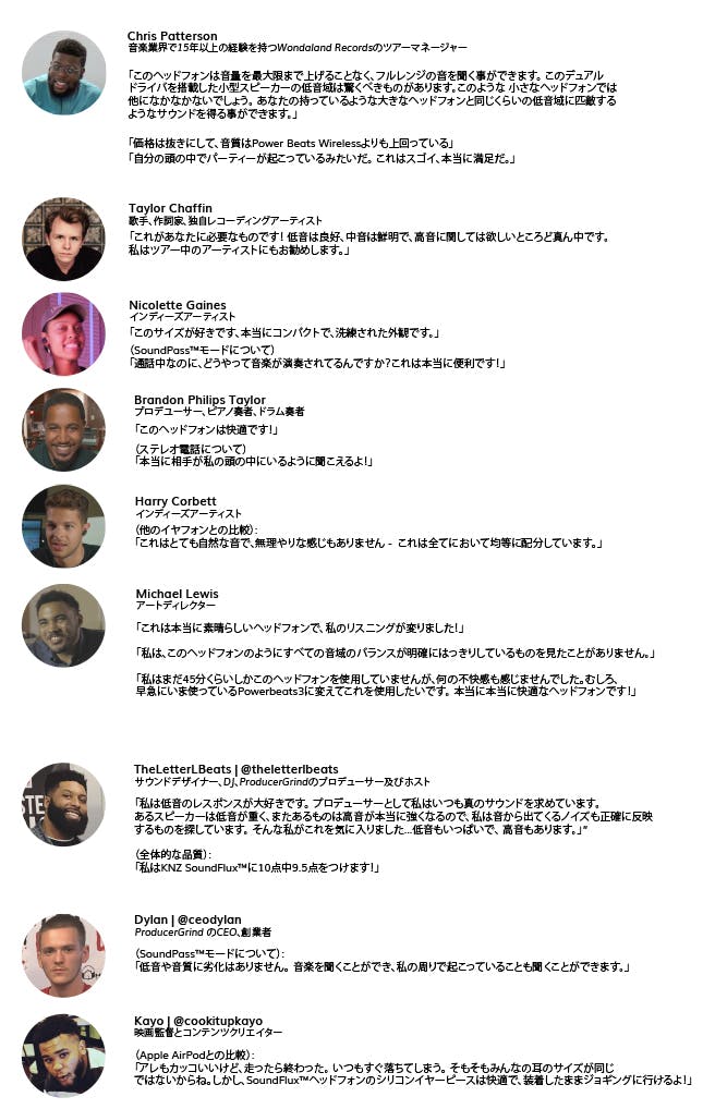 世界初のステレオBluetoothヘッドフォン、モトローラS9から、過去10年間で、当社のエンジニアおよび製造チームメンバーは、多くの有名ブランドのいくつもの優れた製品の開発をしました。そして、 その受賞歴を誇るデザインチームと共に、KNZ®は北米市場で知名度の高いブランドになりつつあります。