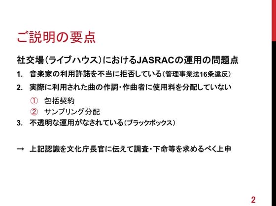 管理事業法第20条は、著作権等管理事業者の業務運営に「委託者又は利用者の利益を害する事実」があるときは、文化庁長官が業務改善命令を発することができる旨定めているところ、JASRACは、社交場(ライブハウス)に係る演奏権管理事業の運営において、実際に演奏された楽曲を特定しない許諾・徴収・分配の方法に依拠した運用を行い、これにより、実際に演奏された管理著作物の委託者に著作権使用料を分配せず、もって「委託者の利益を害する」運営(管理事業法20条)を行っている(下記3)。