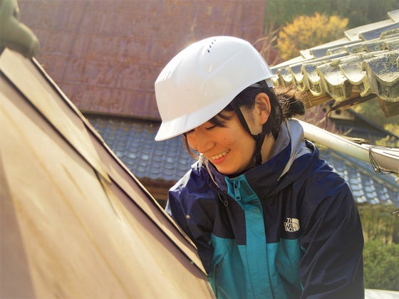 屋根を解体中のおぎちゃん。(ヘルメットのサイズが合ってないの、何だかあざといですね)